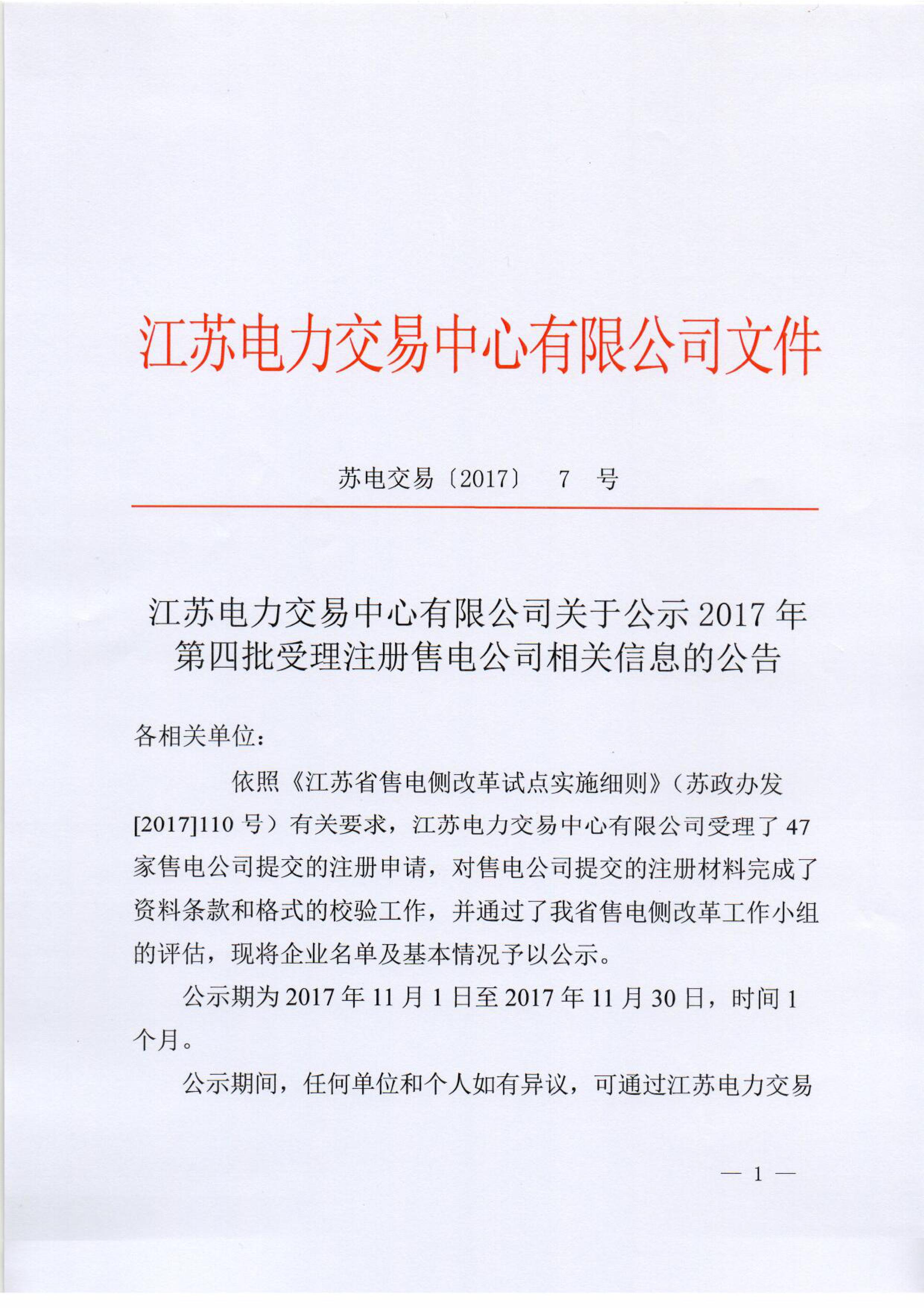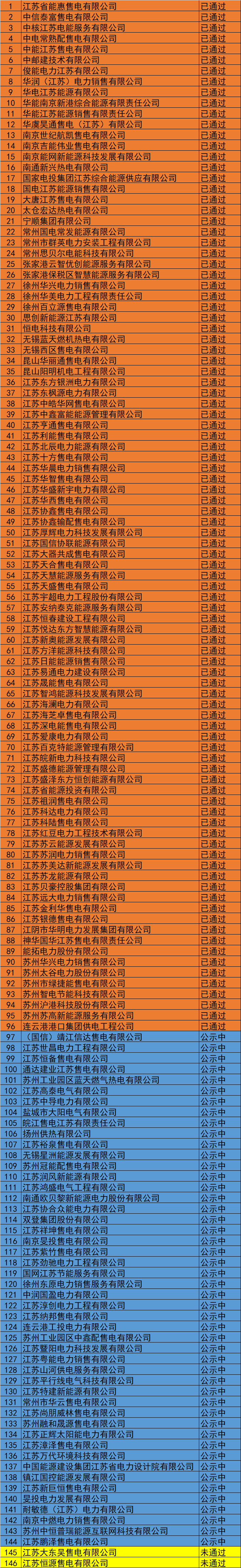 江苏电力交易中心消息,11月1日江苏省公示第4批47家售电公司。截止11月1日,江苏省已经公示通过97家售电公司(本省96家,北京市推送1家), 公示总数达到146家(2家未通过),全部名单见后文。
