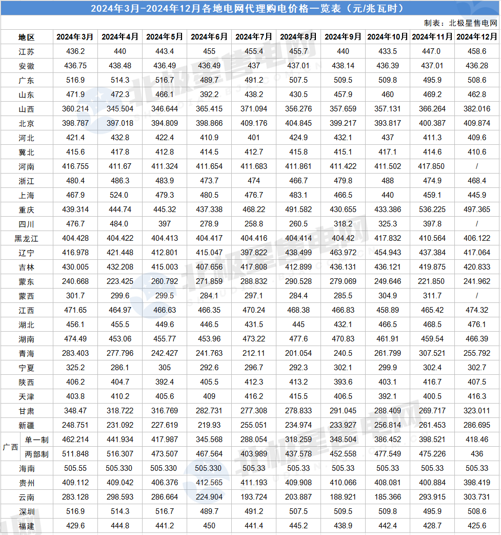 近日,全国各地2024年12月电网企业代理购电价格陆续公布。北极星售电网汇总了2024年3月-2024年12月各地电网企业代理购电价格,如下图所示: