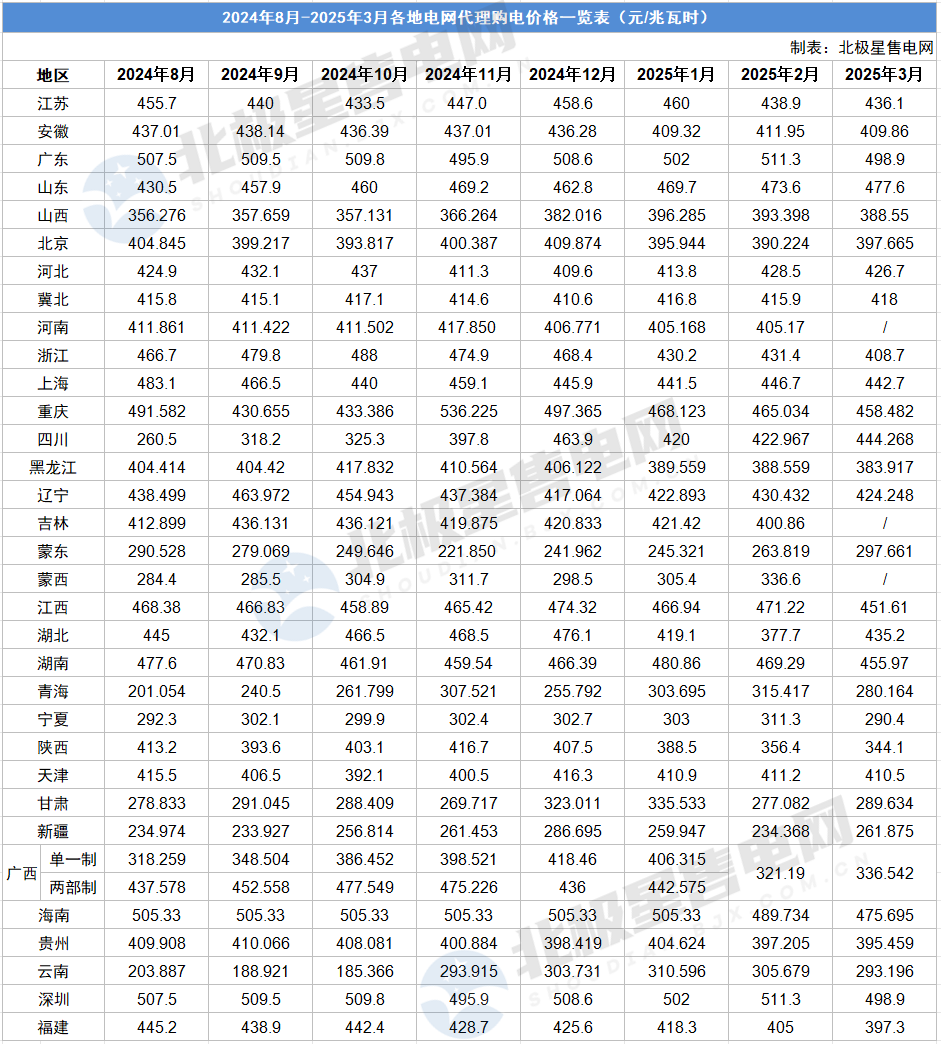 近日,全国各地2025年3月电网企业代理购电价格陆续公布。北极星售电网汇总了2024年8月-2025年3月各地电网企业代理购电价格,如下图所示: