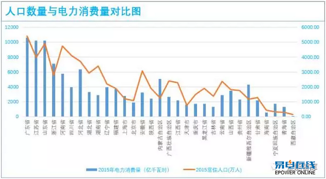 但是,其他省份的两项排名出入较大。浙江、内蒙古、新疆、山西、上海用电量分别位于全国4、7、8、12、17位,但其人口位于全国第10、23、25、18、24位。河南、四川、广西、江西、黑龙江人口排名全国3、4、11、13、16位,但其用电量位居全国第6、9、18、22、26位。