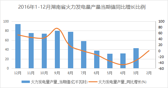 图5 2016年1-12月湖南省火力发电量产量当期值同比增长比例