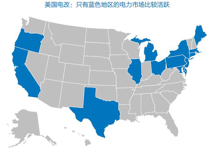 那么,中国售电市场的未来还有的搞吗?笔者判断,如果以目前的情形延续下去的话,中国电力市场的未来可能会像美国一样。大家都知道,目前,美国一些地方的电力市场已经非常活跃,售电公司发展空间非常大,但在另一些地方,出于供电安全方面的考虑,地方政府并没有推进电力改革。