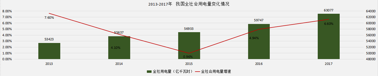 根据国家能源局公布2017年我国电力工业运行数据显示,2017年,我国全社会用电量63077亿千瓦时,同比增长6.6%。