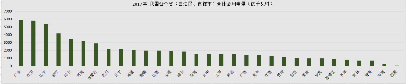 从全社会用电量总量上看,2017年,我国各个省(自治区、直辖市)全社会用电量东高西低的情况依然加剧。