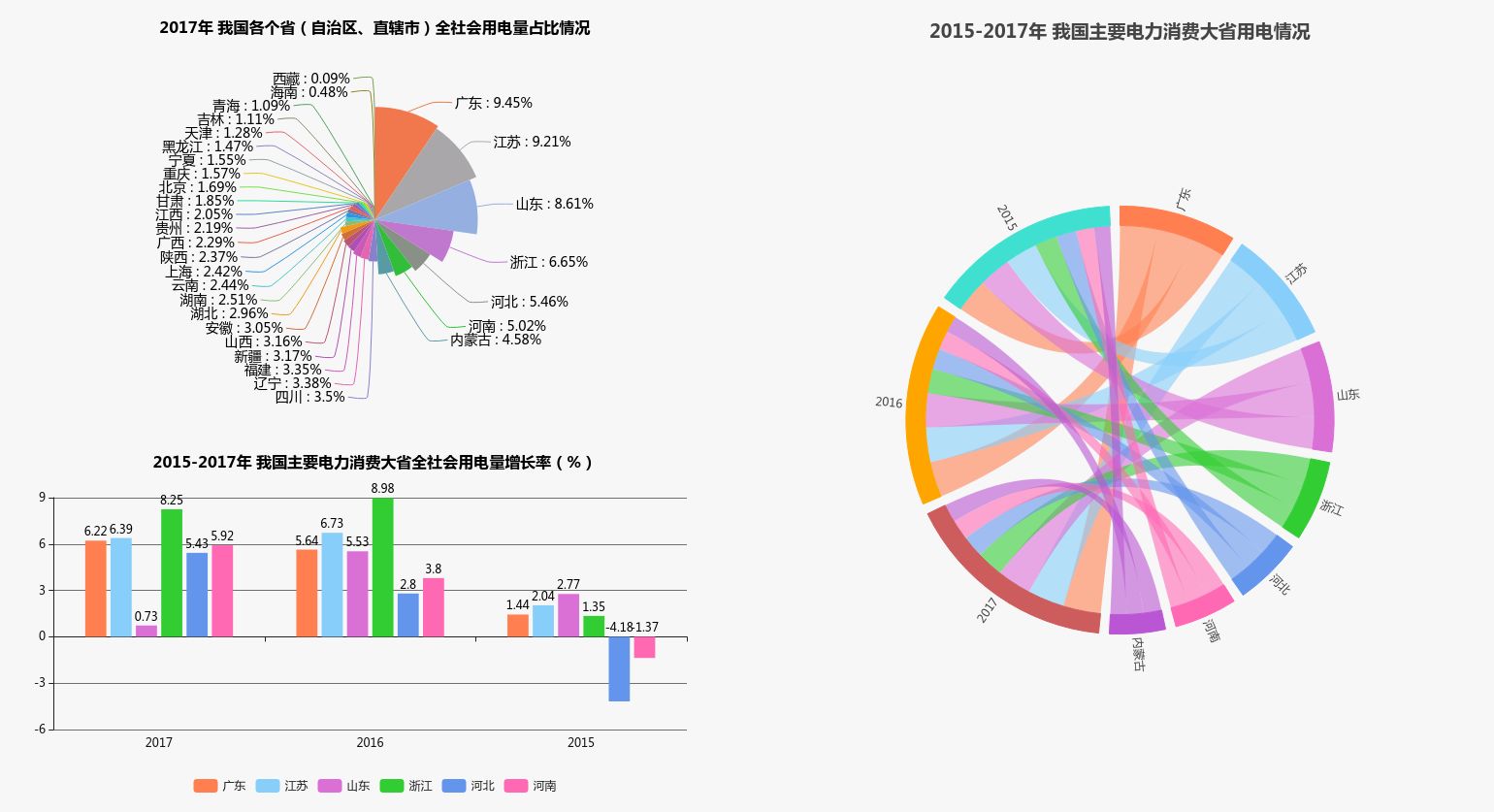 2017年,东部、南方地区依然是我国主要的经济区,广东、江苏、山东、浙江GDP超过50000亿元4个经济大省,同时全社会用电量也居于全国前四位,四个省份综合占我国全社会用电量的33.9%,与去年同期相比下降了0.1个百分点。