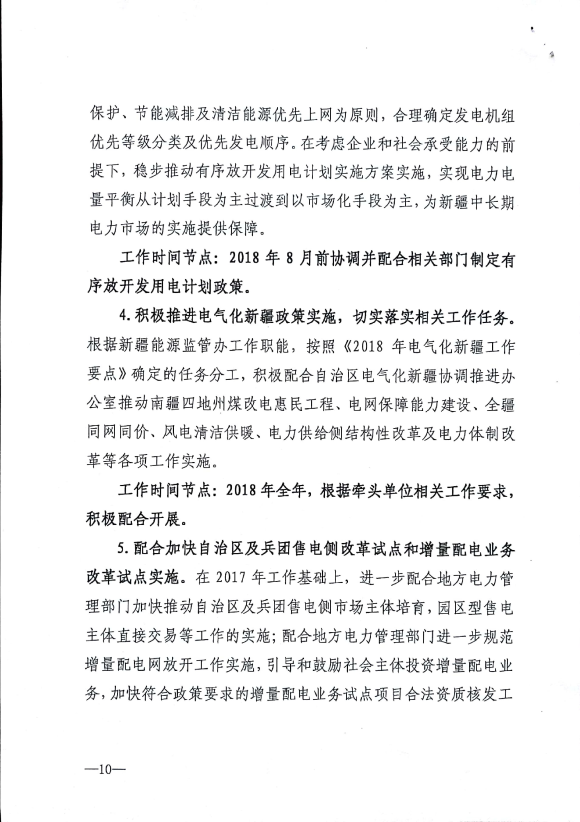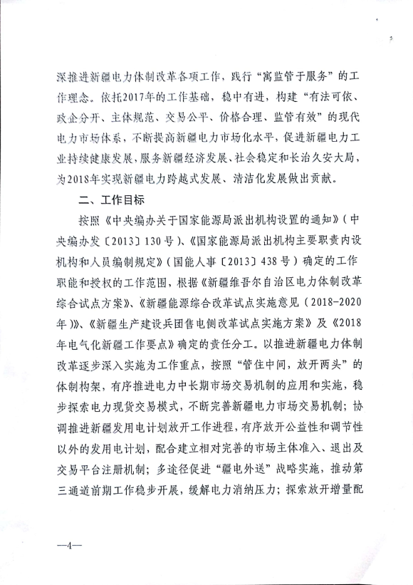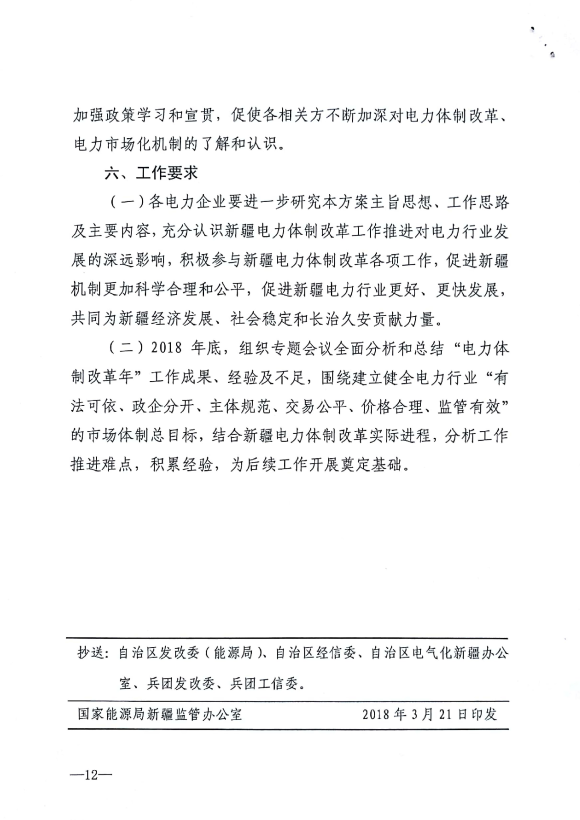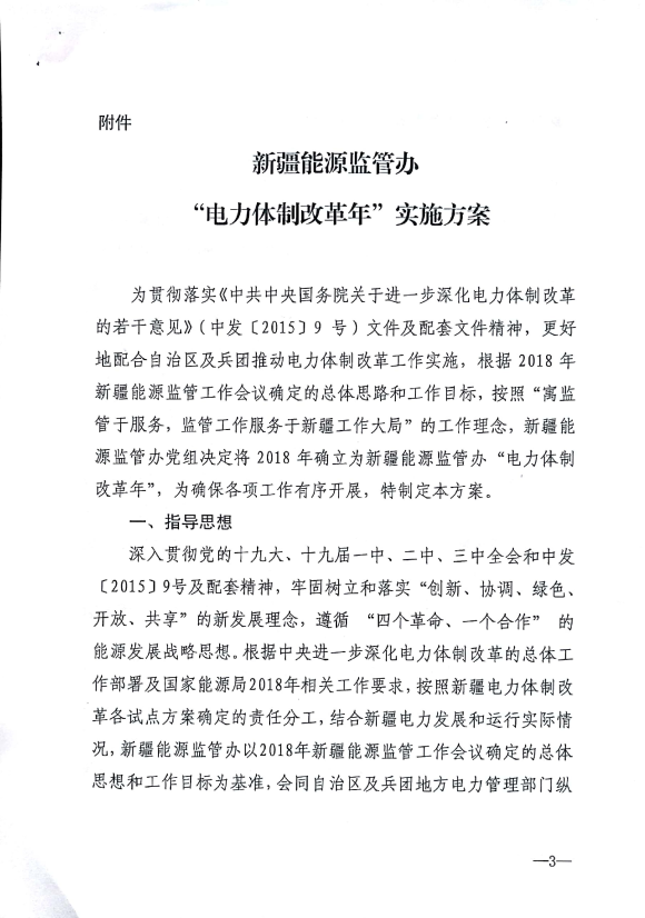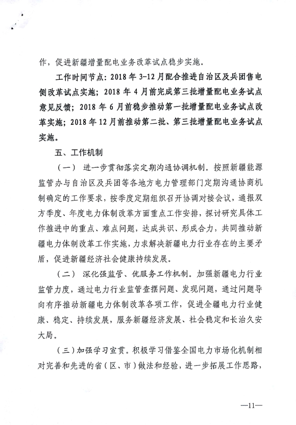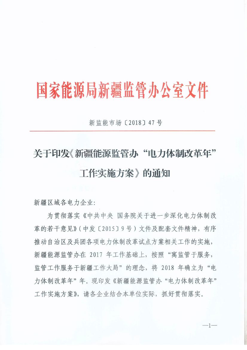 新疆能监办日前发布了《“电力体制改革年”工作实施方案》。新疆能监办将2018年确立为“电力体制改革年”,探索放开增量配电业务、分布式电力市场化交易及售电侧改革等专项改革试点科学合理的推进路径,促进专项改革试点持续深入。