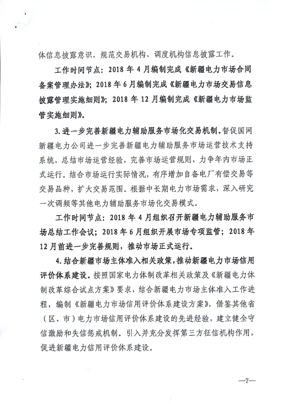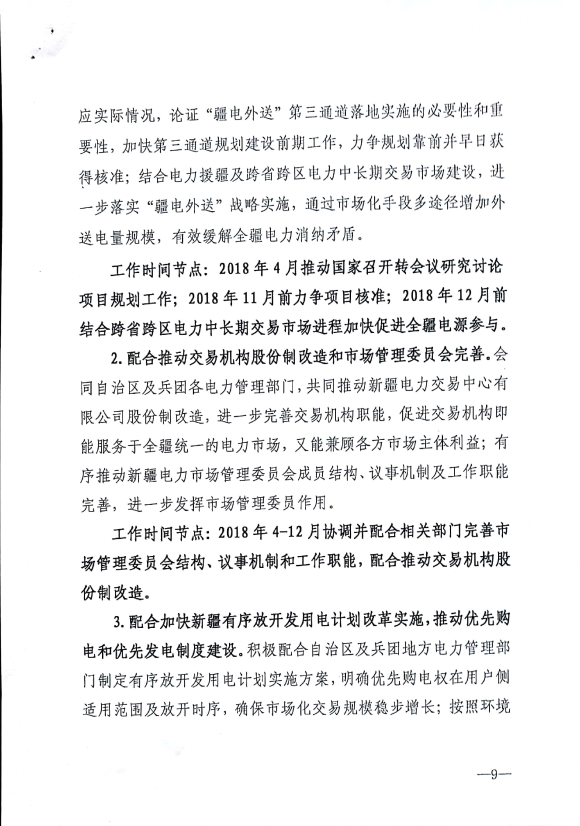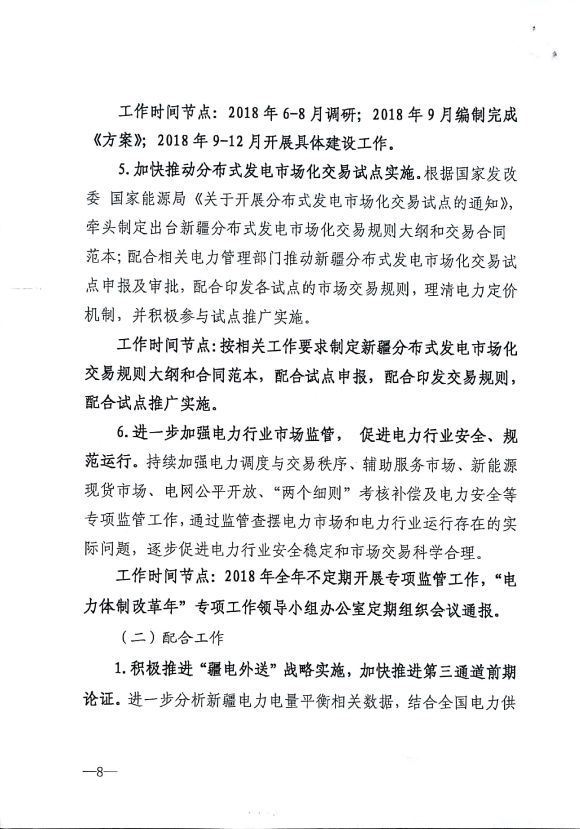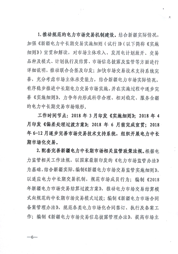 推动规范的电力市场交易机制建设。时间节点:2018年3月印发《实施细则》,2018年4月印发《偏差处理过渡方案》,2018年6月完成宣贯,2018年6-12月逐步完善市场交易技术支持系统,组织开展电力中长期市场化交易。