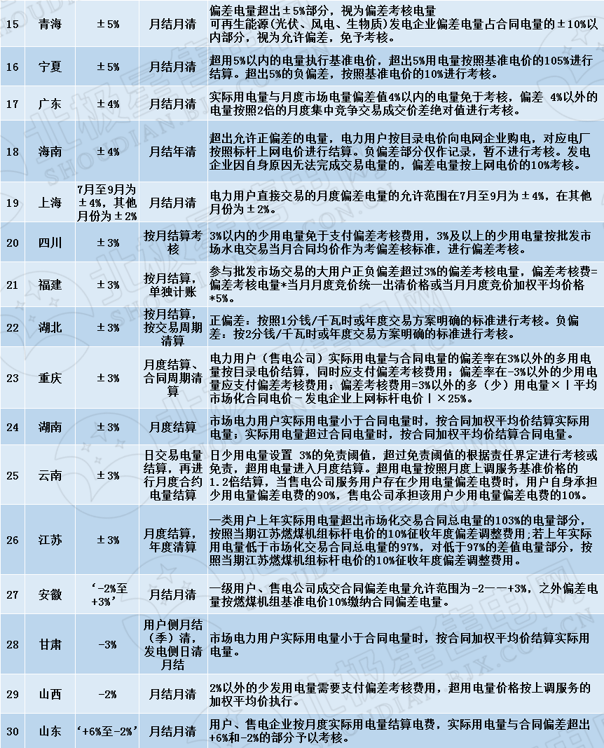 截至目前,从已公布偏差考核范围的30个省区市来看,实行5%范围和3%范围的省份比较多。其中5%范围的偏差考核地区数量最多,全国有16个省区市正在实行。其中±5%有9个省区市,其次为实行-5%,有7个省区市。±4%范围的省份只有两个,分别为广东和海南。±3%范围的省份共有7个,此外还有-3%以及-2%范围各有一个省份。其中安徽省规定-2至+3%的免考核范围,而用电大省山东则实行的是+6%至-2%的弹性范围,国际化金融之都上海市偏差考核确定了±4%至±2%(注:考虑到7月至9月为暑热季节,用电量比较高,偏差考核调整为±4%,其他月份为±2%)。