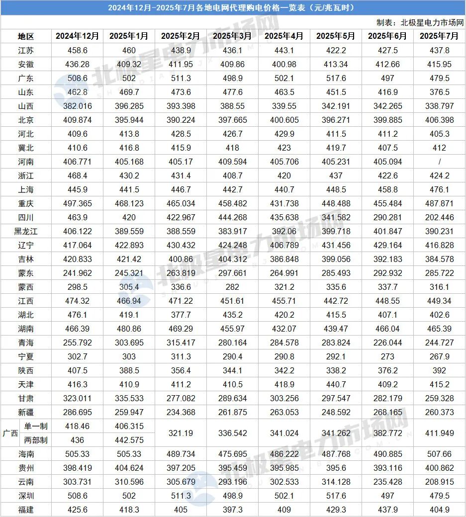 北极星售电网获悉,近日,全国各地2025年7月电网企业代理购电价格陆续公布。北极星售电网汇总了2024年12月-2025年7月各地电网企业代理购电价格,如下表所示: