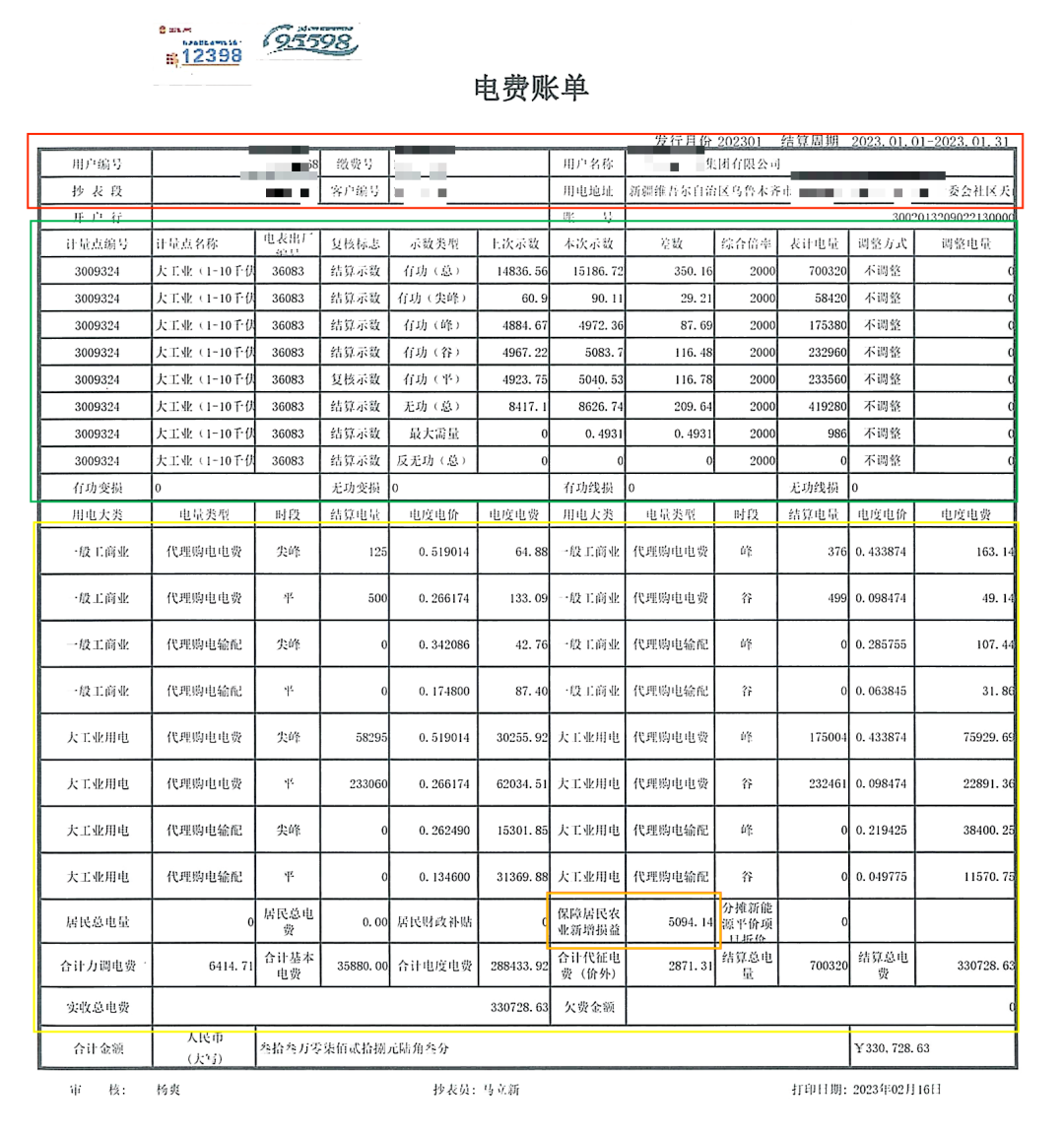 以国网新疆电力有限公司发布的乌鲁木齐某代理购电用户1月份电费账单为例: