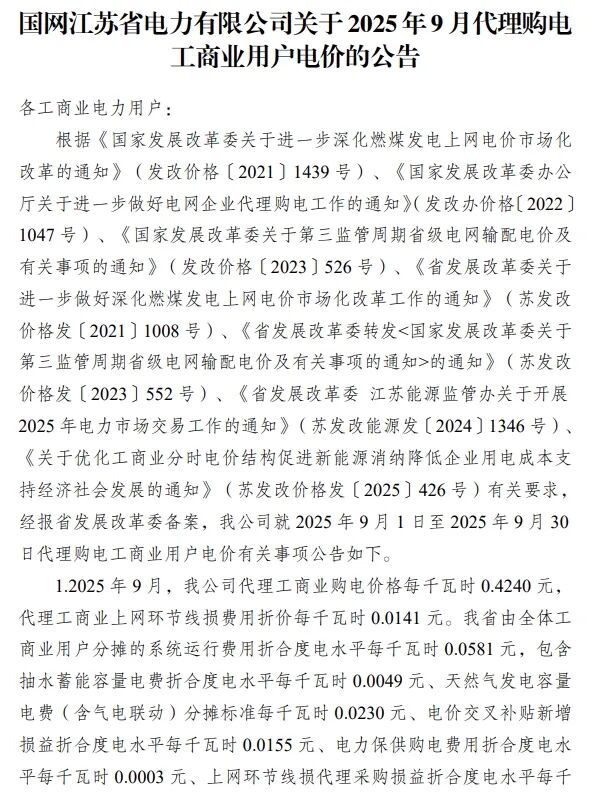以下为2025年9月各地电网企业代理购电价格表,顺序依次为:江苏、安徽、广东、山东、山西、北京、河北、冀北、河南、浙江、上海、重庆、四川、黑龙江、辽宁、吉林、内蒙古东部、内蒙古电力集团、江西、湖北、湖南、青海、宁夏、陕西、天津、甘肃、新疆、广西、海南、贵州、云南、深圳、福建。