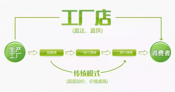工厂店(懂的人直接跳转下一段):“工厂店”概念源于西方国家,工厂店采用从工厂直接到消费者的销售模式,摒弃了分级批发商、分级代理等中间繁冗环节,这样消费者购买起来更加方便,也无需再为中间环节买单。
