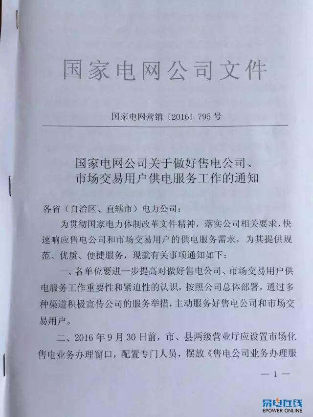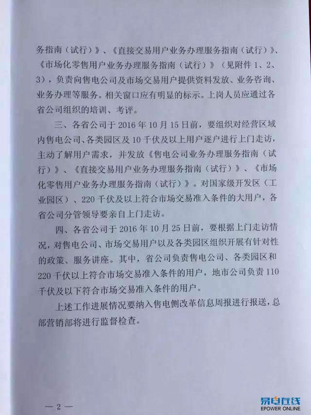 “各省公司于2016年10月15日前,要组织对经营区域内售电公司、各类园区及10千伏及以上用户逐户进行上门走访,主动了解用户需求”