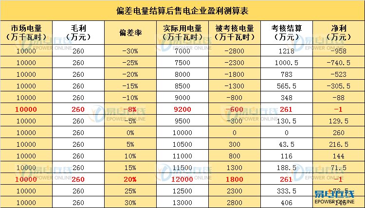 通过表格我们可以直观看出,对于一个月电量1亿度体量的售电公司,当偏差率控制在-8%至+20%之间,企业才能不赔钱。