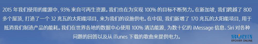 苹果一直以来都提倡使用可再生能源,在其官方网页环境责任页面中写道:100% 使用可再生能源,是我们的顶级目标。